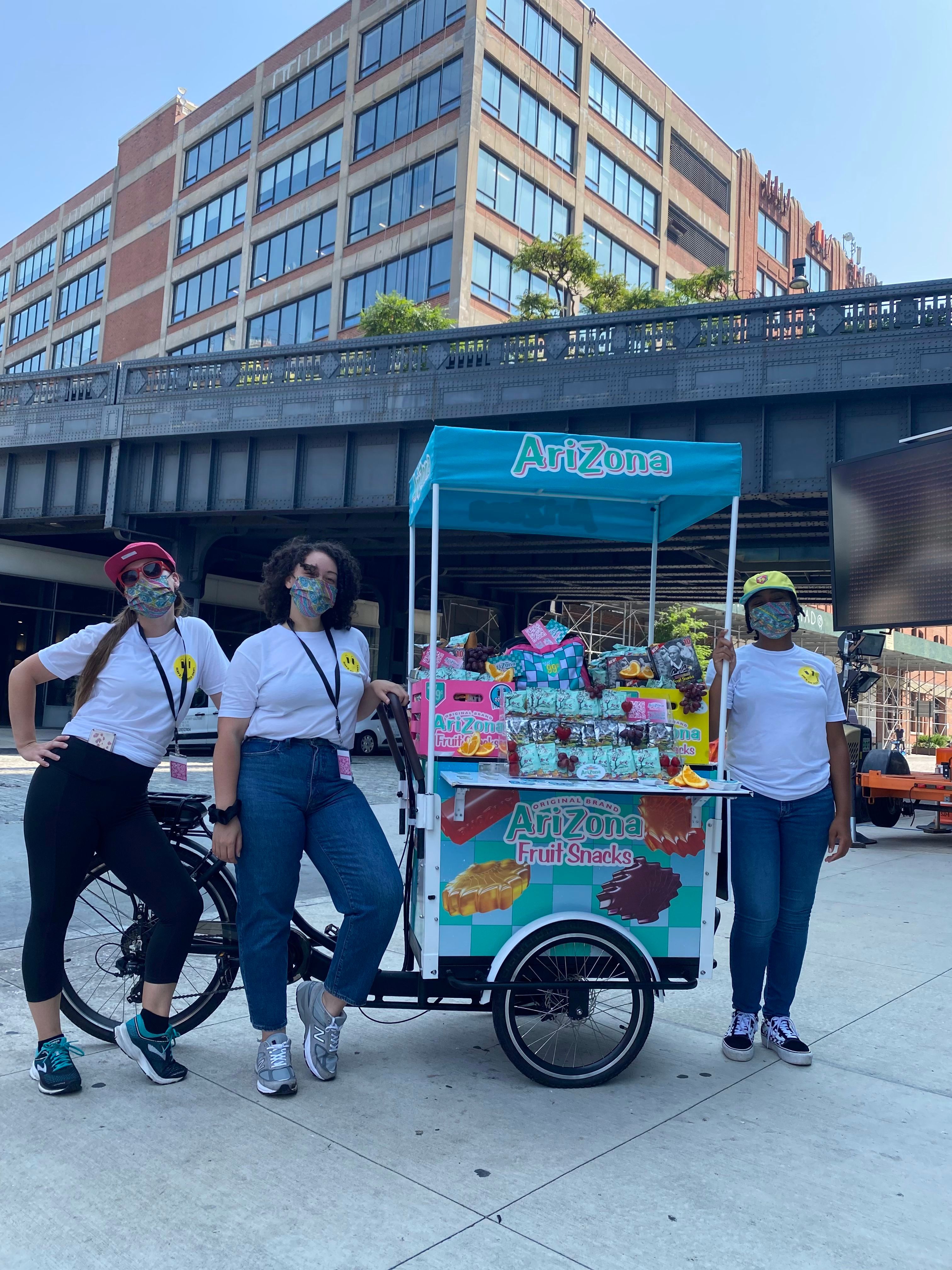 The Arizona Fruit Snacks product launch activation lasted nine exciting days and took place across different busy areas in New York. These locations included NYU, Flatiron, Gantry Plaza, Central Park, Columbia, and Domino Park. Wherever the truck and trike stopped, the two customized vehicles were sure to exude all things Arizona: Arizona’s eye-catching logo, their new delicious fruit snacks, and the classic baby blue checkered pattern and pink accents that Arizona is so well-known for.