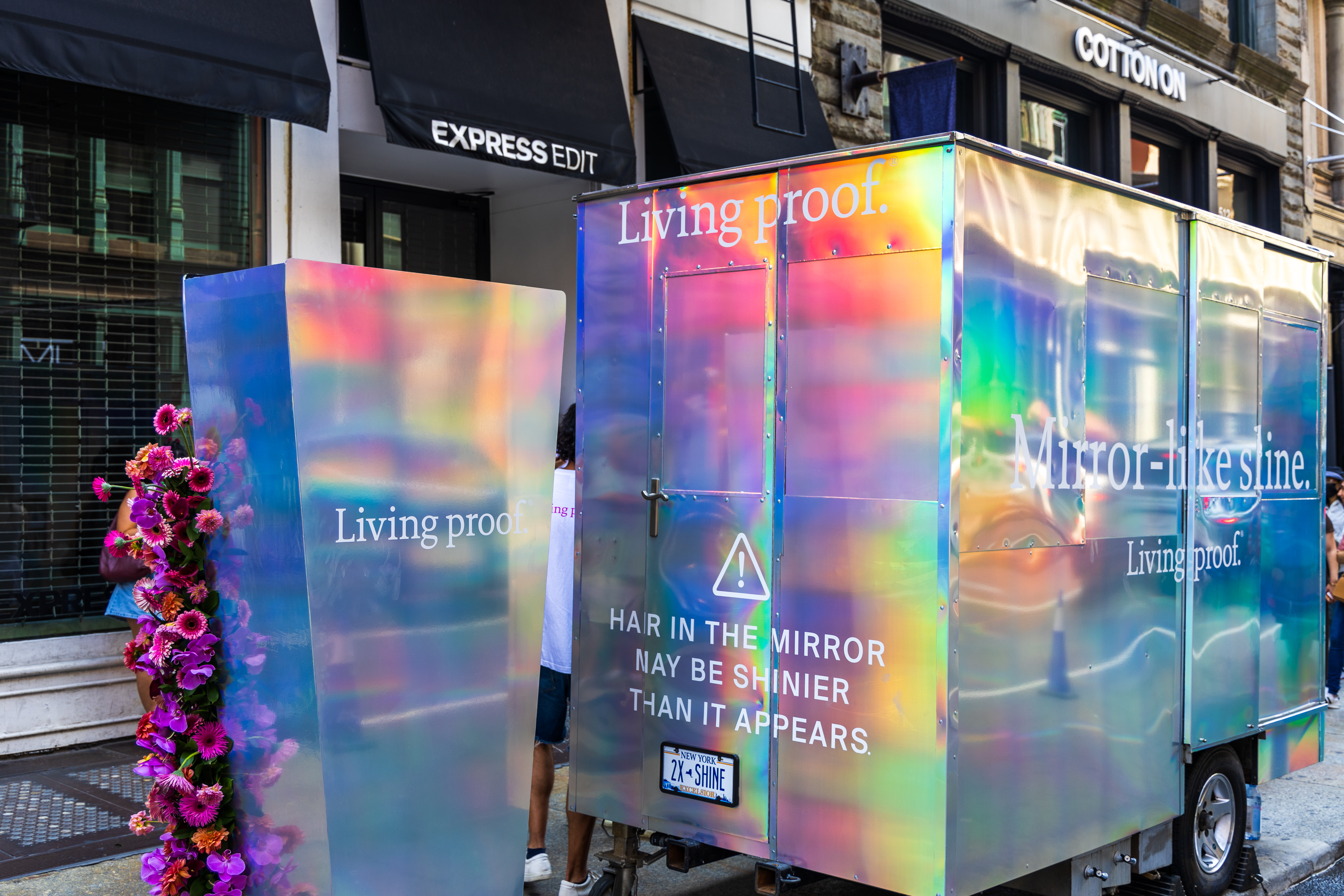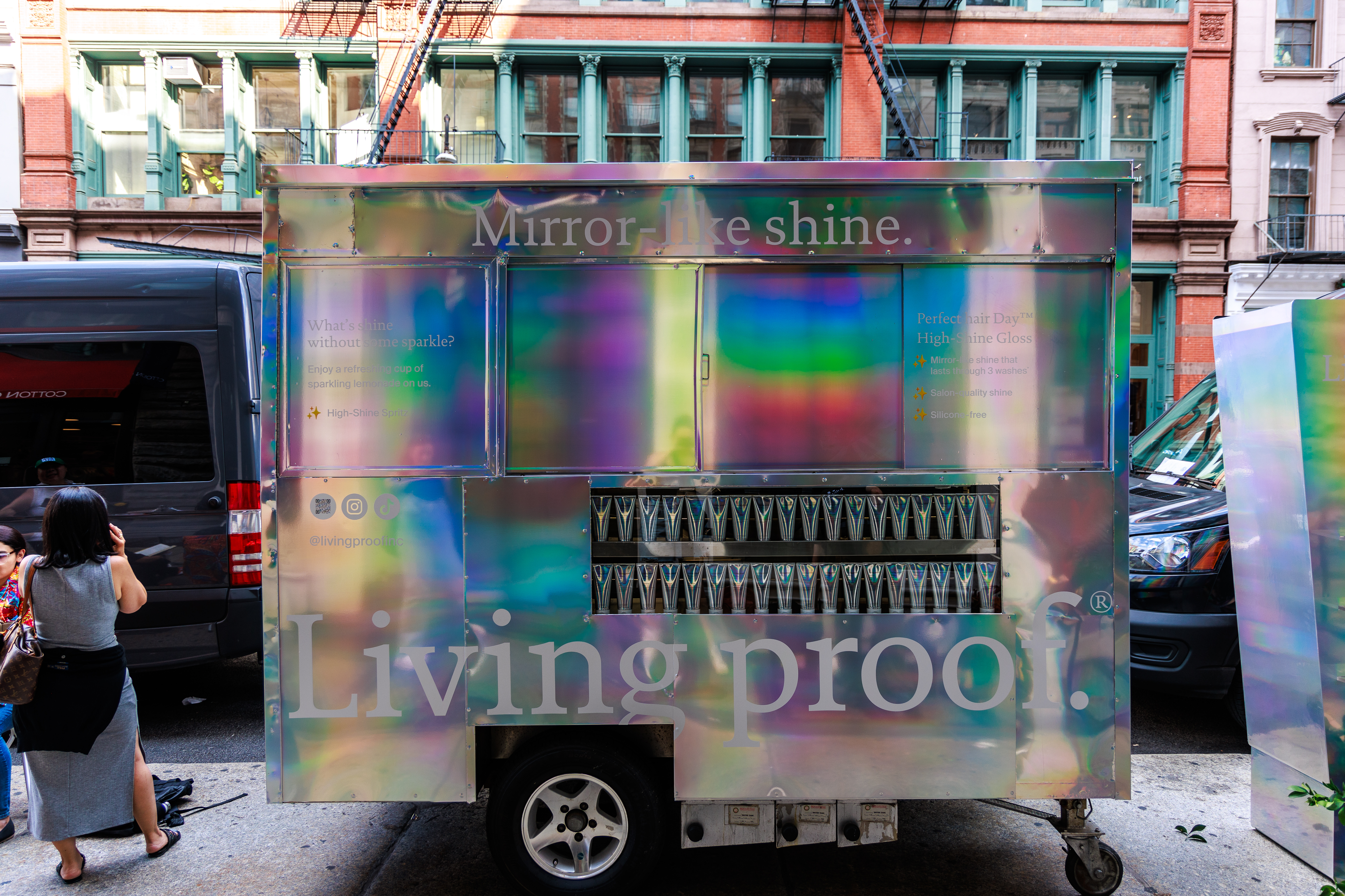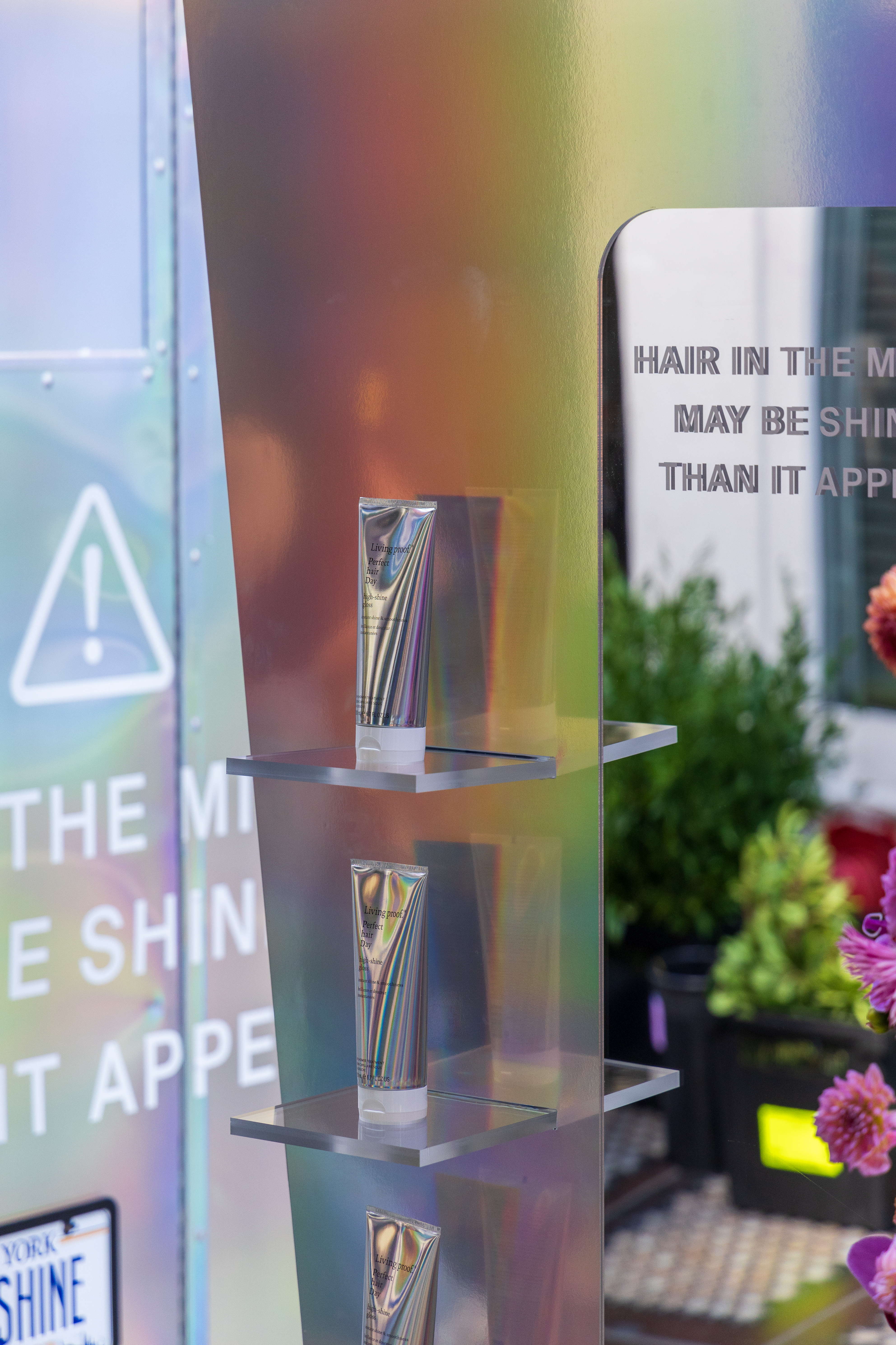 New Yorkers were fully immersed in the product’s mirror-like benefits, with a vinyl shine so bright they nearly needed shades. From the custom beauty cart and mirrored display in the shape of the High-Shine Gloss bottle to the “2x SHINE” license plate and mirrored A-frame, every last detail was designed to dazzle.