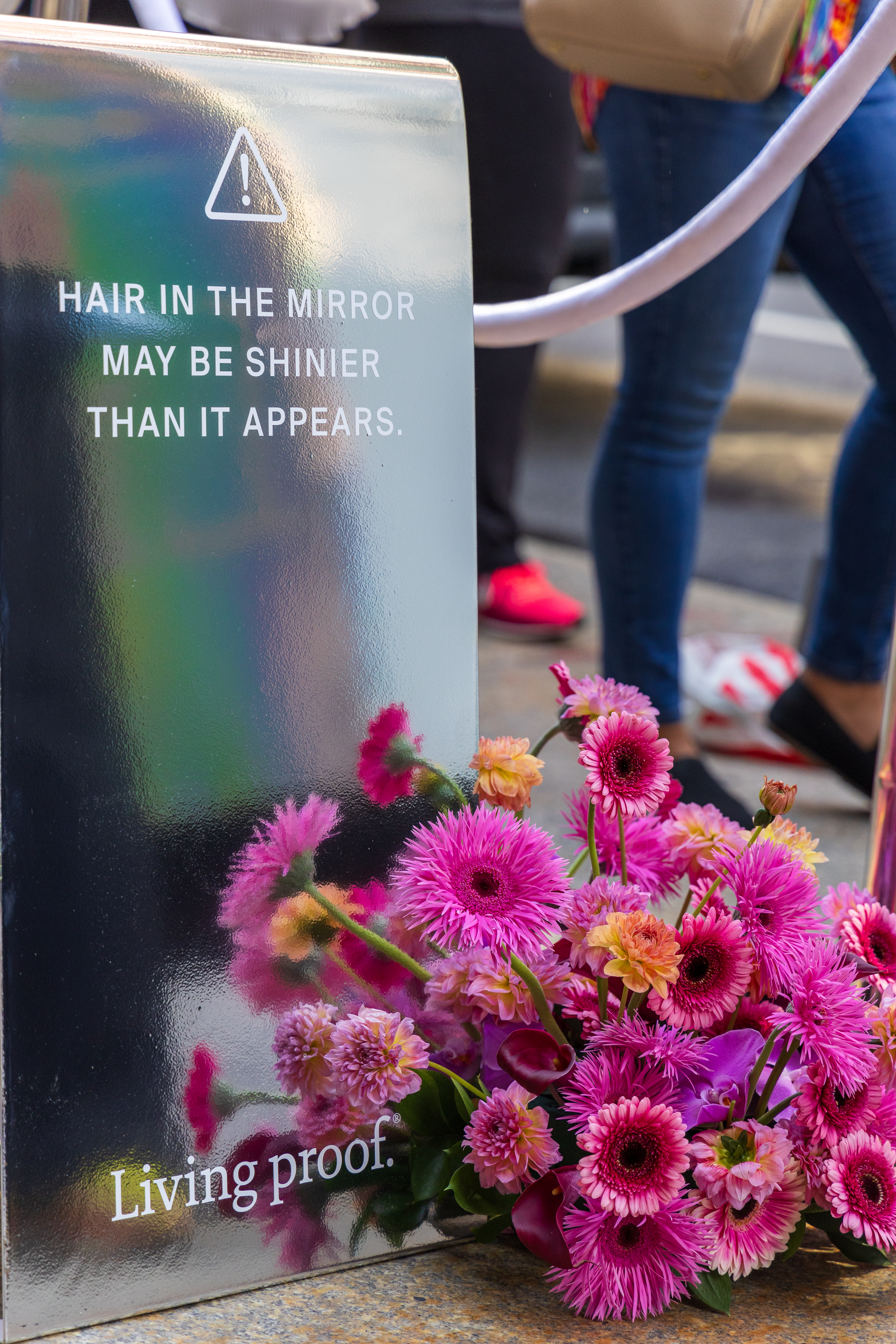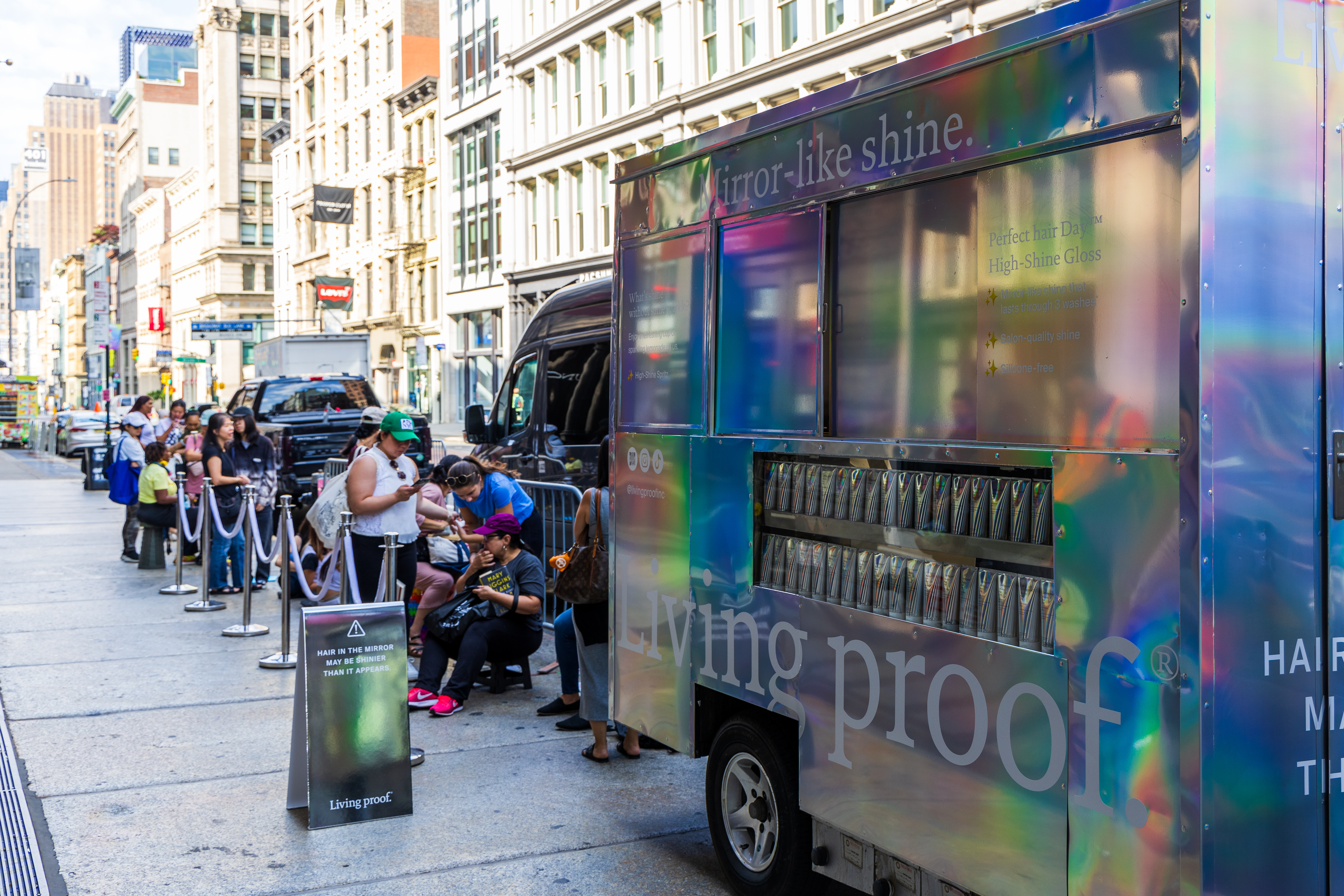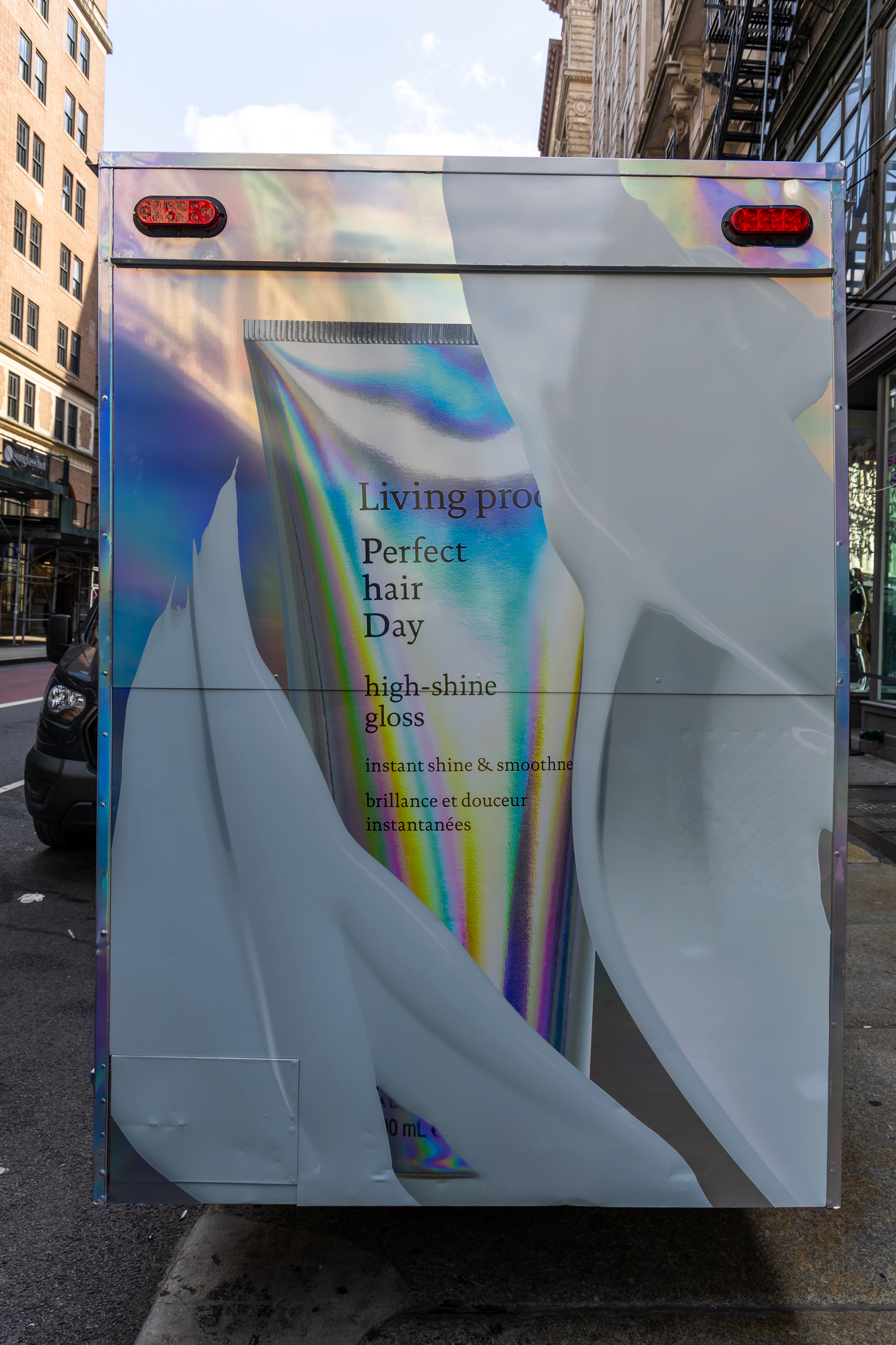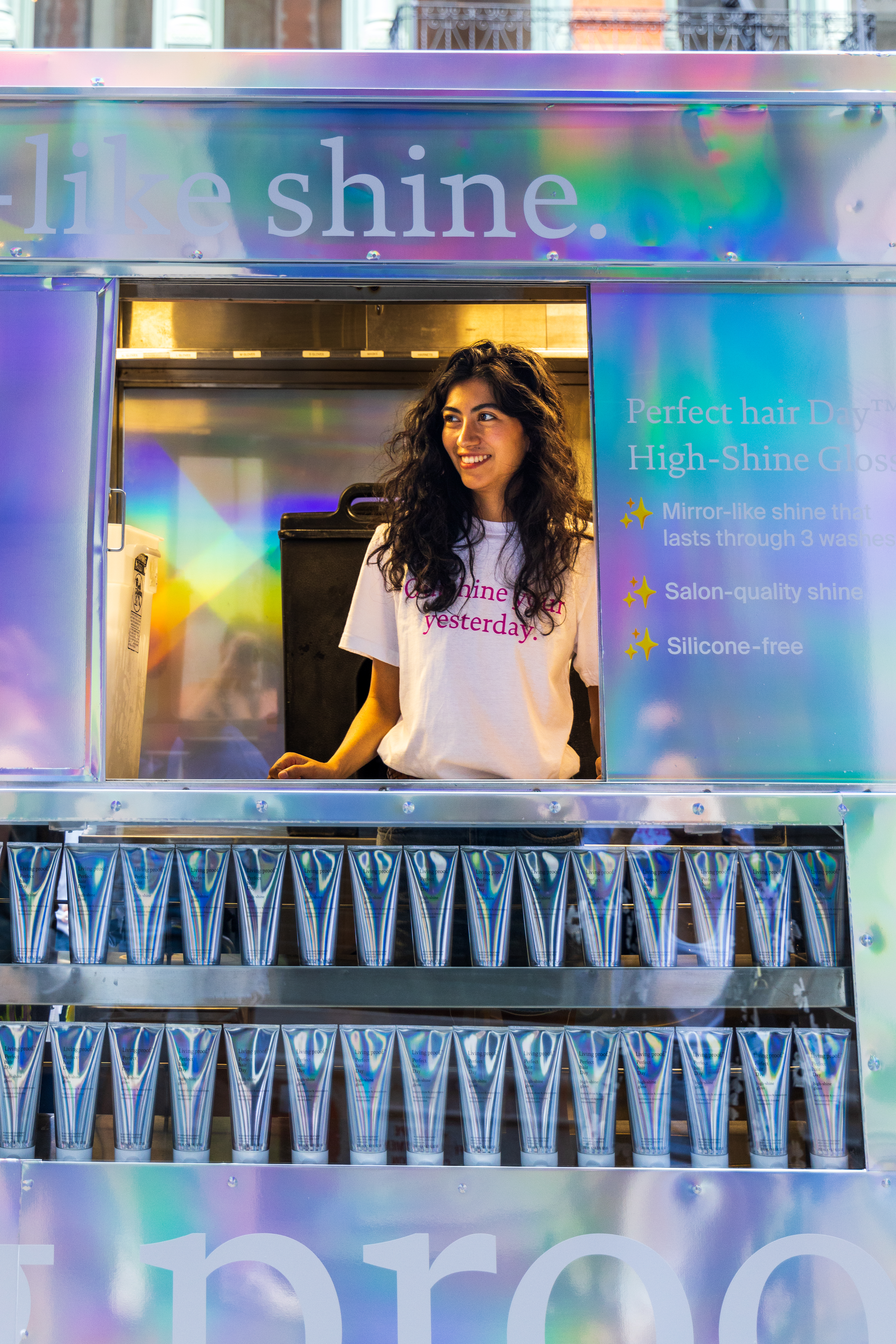 New Yorkers were fully immersed in the product’s mirror-like benefits, with a vinyl shine so bright they nearly needed shades. From the custom beauty cart and mirrored display in the shape of the High-Shine Gloss bottle to the “2x SHINE” license plate and mirrored A-frame, every last detail was designed to dazzle.